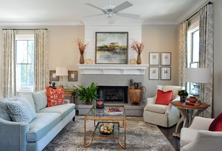 Our Town Plans shows how welcoming SW Accessible Beige is in this beautiful family room with built-in fireplace.