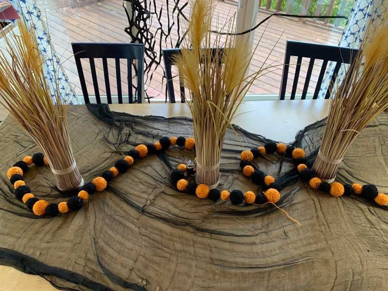 5.) Create movement: I some visual movement to the tablescape by looping two Halloween yarn garlands around the three centerpieces. This added a nice layer of texture, color, and movement all in one!