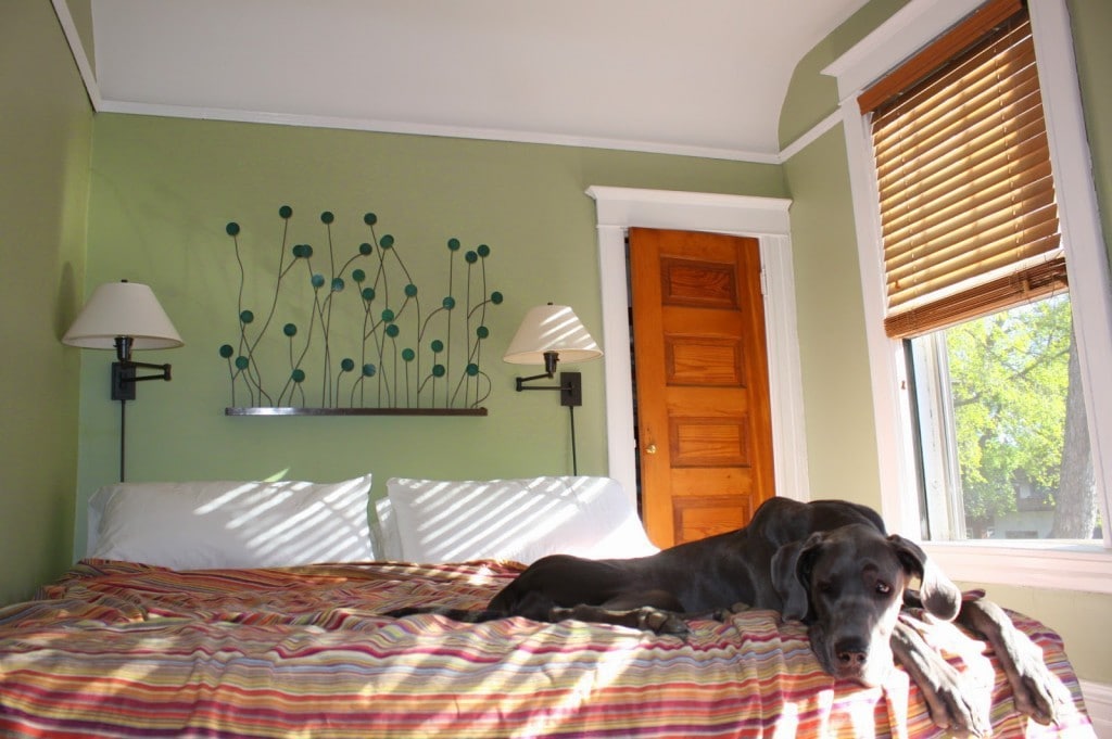 So I realized we never once took pictures of the master bedroom. This is the only one we got. E custom made the platform bed frame so we could squeeze in a king. There wasn’t room for a headboard, so we created one visually with the artwork and the sconces. There wasn’t even room for a bedside table. The closet door you see was mine, and his was across the room.